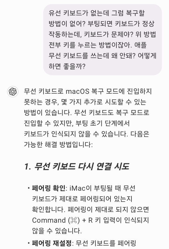 그런데 전 이 커맨드+R을 길게 누르고 있어도, 연속적으로 갈겨도, alt+cmd+R을 눌러도 어떤 방법으로도 복구모드로 진입이 안되는 거예요 그냥 컴퓨터가 평소대로 켜져 버립니다