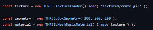 new THREE.MeshBasicMaterial({ map: new THREE.TextureLoader().load('https://images.unsplash.com/photo-1520315342629-6ea920342047?ixlib=rb-1.2.1&ixid=MnwxMjA3fDB8MHxwaG90by1wYWdlfHx8fGVufDB8fHx8&auto=format&fit=crop&w=2080&q=80') })