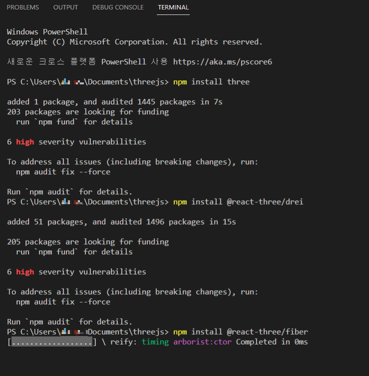 아래의 명령어들로 THREE와 THREE 작업을 도와주는? 패키지 두개를 설치한다.