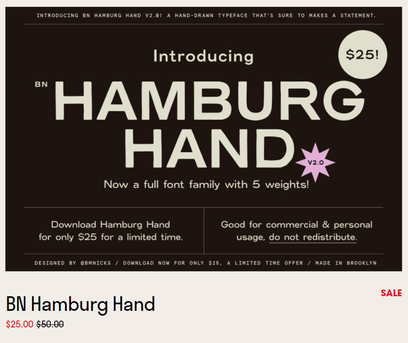 폰트 사이트의 Commercial free font 섹션에서 Hamburg Hand라는 마음에 드는 서체를 발견해 다운을 받고 라이센스 더블체크를 해봤다. 구글링해도 2020년까지도 100% 프리라는 글이 있는데 더 뒤져보니 디자이너의 개인 홈페이지에서 이렇게 유료로 팔고 있는 것을 발견했다. 바로 폰트를 삭제했다.
