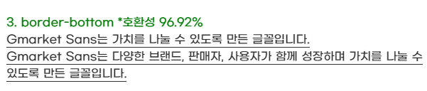위 이미지에서 볼 수 있듯이 텍스트 자체에 밑줄을 주고 위치를 조정하여 여백을 주었기때문에 1번 방법의 밑줄 모양 그대로 위치만 내려왔다는 점에서 다른 방법과 차이가 있다.