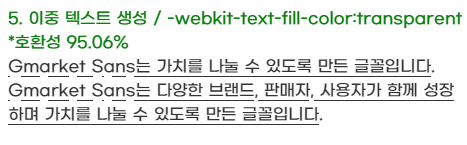 5. data- 속성을 이용하여 content에 텍스트를 넣어 텍스트를 이중으로 만든 후 가상요소 content:attr(data-)로 넣은 텍스트에 -webkit-text-fill-color: transparent;를 적용해 투명하게 만든 후 text-decoration:underline; text-decoration-color 속성을 이용하는 방법