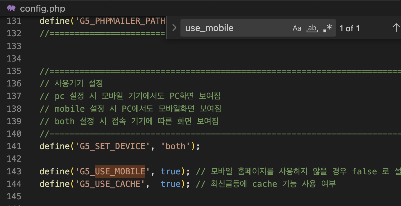 2. use_mobile을 검색해 'G5_USE_MOBILE' 부분을 찾는다.