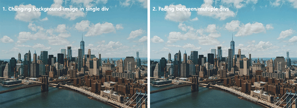 2번 코드는 div 두 개에 각각 background-image를 주고, 투명도로 전환효과를 주는 방법이다.