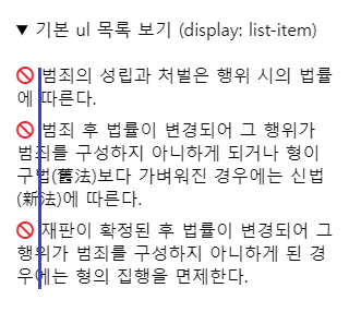 - ul li 구조로 마크업을 하면 li의 텍스트가 여러줄이 되도 들여쓰기가 (지금 이 문단처럼) 자동으로 들어간다. list-item의 마커 타입이 disc,square 등 꽤나 다양하다고 해도 한계가 있기 때문에 보통은 ul {list-style: none;}으로 초기화 시키고 커스텀 이미지를 li 태그 안에 사용할 때가 많다. 이 경우 아래 이미지의 파란선처럼 텍스트 들여쓰기가 맞지않다.
