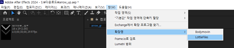 위 LottieFiles plugin for Adobe After Effects 플러그인을 설치해 줍니다.