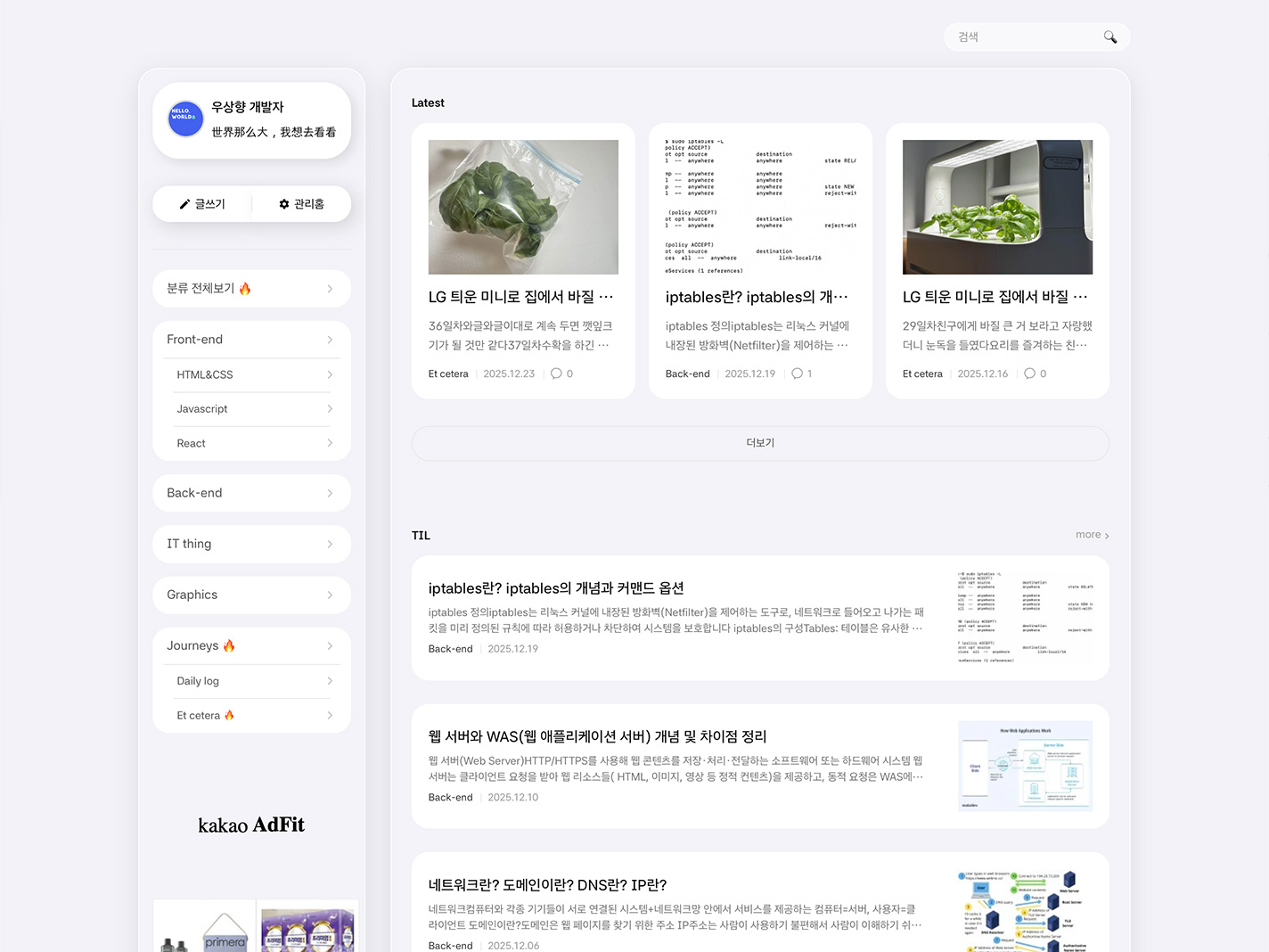 Glassmorphism UI를 적용한 티스토리 블로그 반응형 '글래스 테마' 스킨입니다iOS 26의 liquid glass UI를 참고해 만들었습니다 레포지토리 링크다운로드 링크주요 특징- 블로그 광고, SEO(검색 엔진 최적화)를 고려하여 만들었습니다- 티스토리의 Odyssey 스킨에서 리뉴얼 하였습니다- 사이드바 SNS 플러그인(Facebook, Twitter)은 제거했습니다- 카테고리의 🔥이모지는 새 글 표시입니다- 제 블로그를 기준으로 제작된 스킨이라 누락된 기능이나 UI가 있을 수 있습니다- 상세 페이지 우측 상단의 🛠️버튼을 누르면 글 관리 도구가 나옵니다- 상세 페이지 하단의 태그 목록 타이틀인 'Tag+'를 누르면 태그 페이지로 이동합니다- 사이드바의 프로필 박스를 누르면 홈 화면으로..